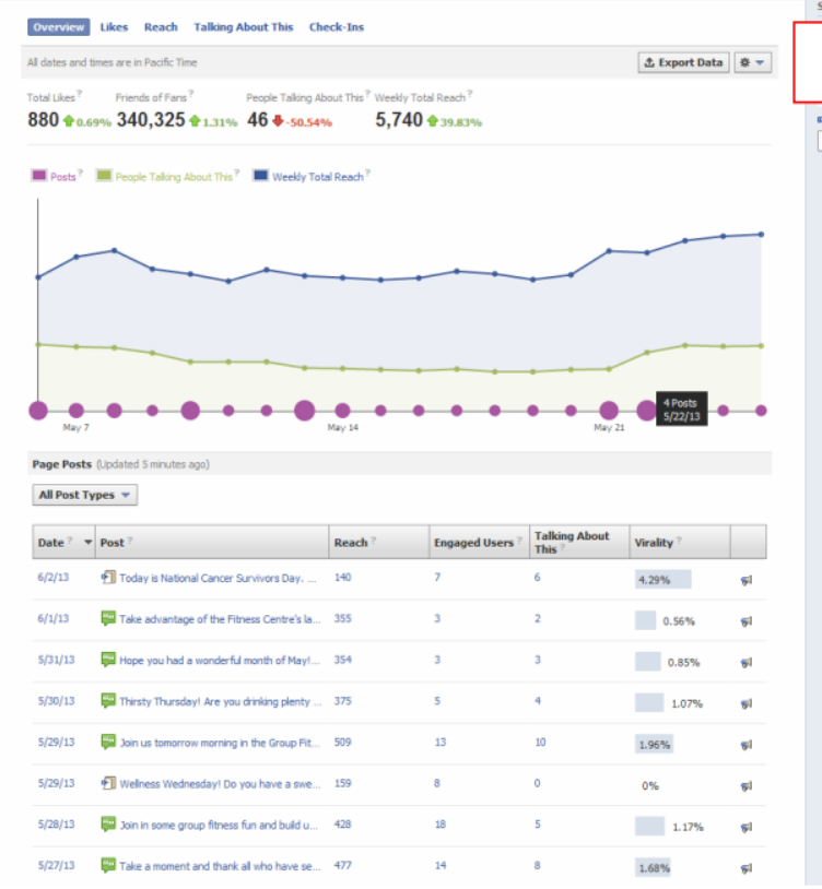 • The weekly total reach for May 19 through May 25 is up 39.83% for a weekly total reach of 5,740. This is not only the page, it includes ads and sponsored stories.  This could reflect people looking for a fitness club while potentially traveling to the high tourist area for the holiday weekend. There is further data to support that which I will address in other metrics.