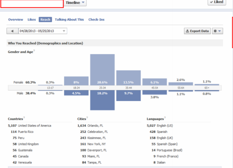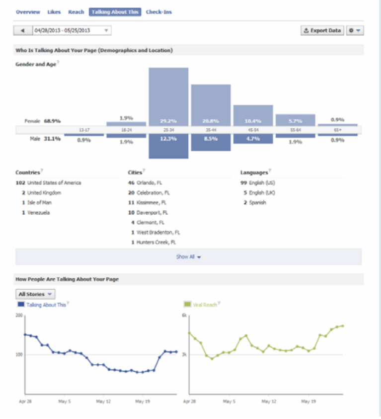 •  It’s no surprise given reach that the most engaged users are also women in the 25 to 34 and 35 to 44 age range. They speak English and the cities with the most activity are in Florida.