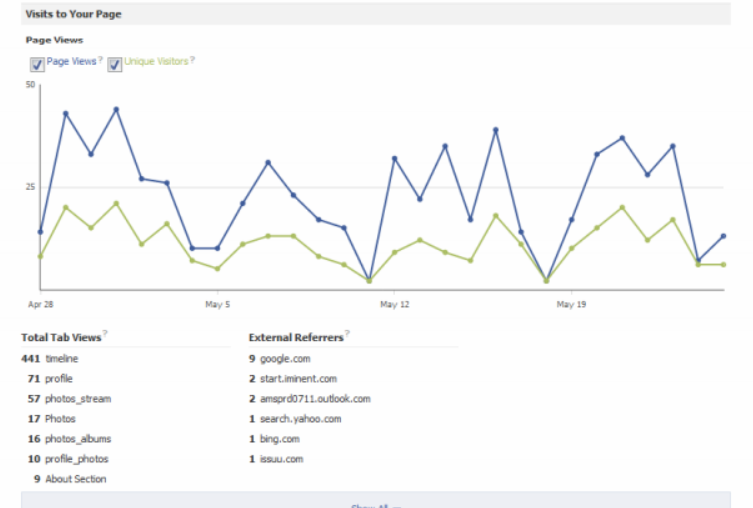 Reach: Facebook Insights Analytics showing page views, highlighting uniques