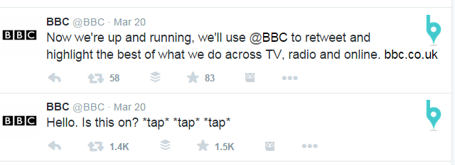 In this slide show, I captured the account’s first two tweets. Right off the bat, BBC didn’t miss a beat by capitalizing on conversational, every day tone: “Hello. Is this on? Brilliant. 1.4K shares worth of brilliant. Then they explain their accounts mission with Tweet #2. It would have been so easy to do that with Tweet #1. They didn’t. Stroke of genius.