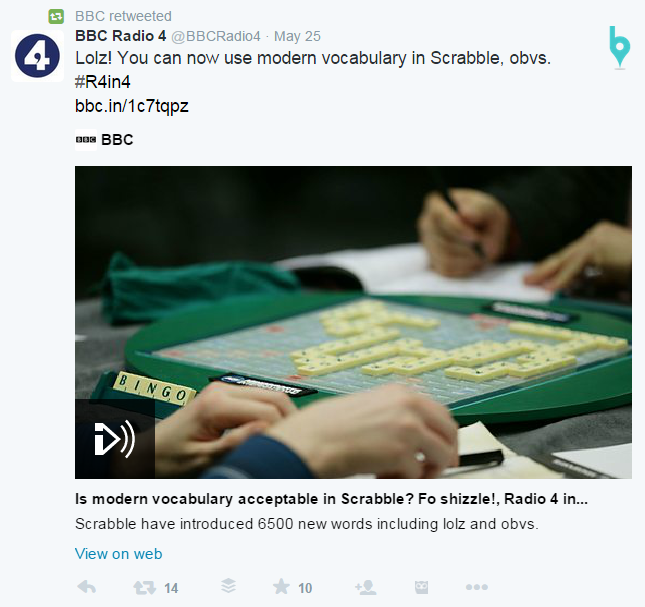 The retweet of the BBC Radio scrabble piece continues to capture the vernacular and tone of the modern day tweeter. It presents a softer, funnier side of BBC letting its hair down. I mean come on! – When do you expect to hear the BBC saying ‘Fo shizzle!”  Stroke of genius part two.
