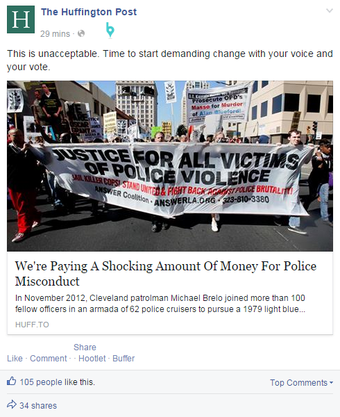 Police misconduct continues to rattle the United States from coast to coast. It resonates with many and Huff Po taps into that “Let me do something, let me be a change agent” aspect of social media that is so pervasive. Their language is a strong call to action and flat out states an opinion, “This is unacceptable.”