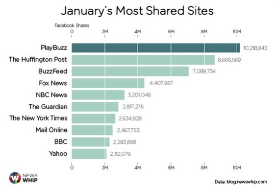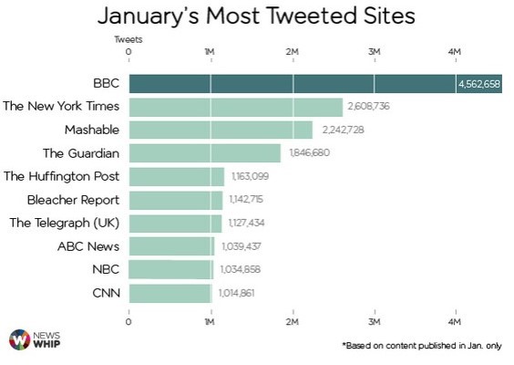 Assignment Snapshot: This post is an assignment for Social Media & News course for my Masters Degree program at the University of Florida. Below you will see the most shared media websites on Facebook and Twitter in January 2015 according to Newswhip. I am tasked with looking at relevant social media accounts and answering the following questions:  What accounts for the successes in shares? Are there similarities in the ways posts are created? What are the key differences? What can you learn from the market leaders which you will put into practice?
