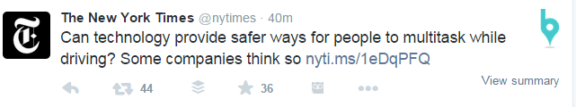 I grabbed the multi-tasking tweet because in and of itself, it’s nothing special. There is no visual. It doesn’t speak to YOU perse. I can’t help but read it though and in 40 minutes it received 44 retweets. Without directly using “you” in the language, the question appeals to the text and driver in all of us. It appeals to the professional in us that executes conference calls we do during the morning commute. I also think that it drives to a little core fear. I’m a mom. The last thing I want is some company saying it’s safe to multitask behind the wheel. Yep, New York Times– you got me. I’m clicking.