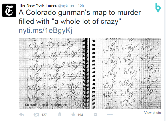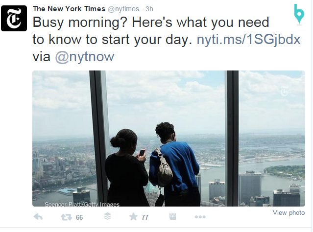 The “here’s what you need to know” concept to start your day is not a new one. You see it online, on TV and hear it on the radio. So what makes this tweet effective? I think it’s the photo. The Freedom Tower’s One World Observatory opened to the public today. The picture is slightly point of view and it’s a place that everyone has some connection to, even if you haven’t set foot in New York.